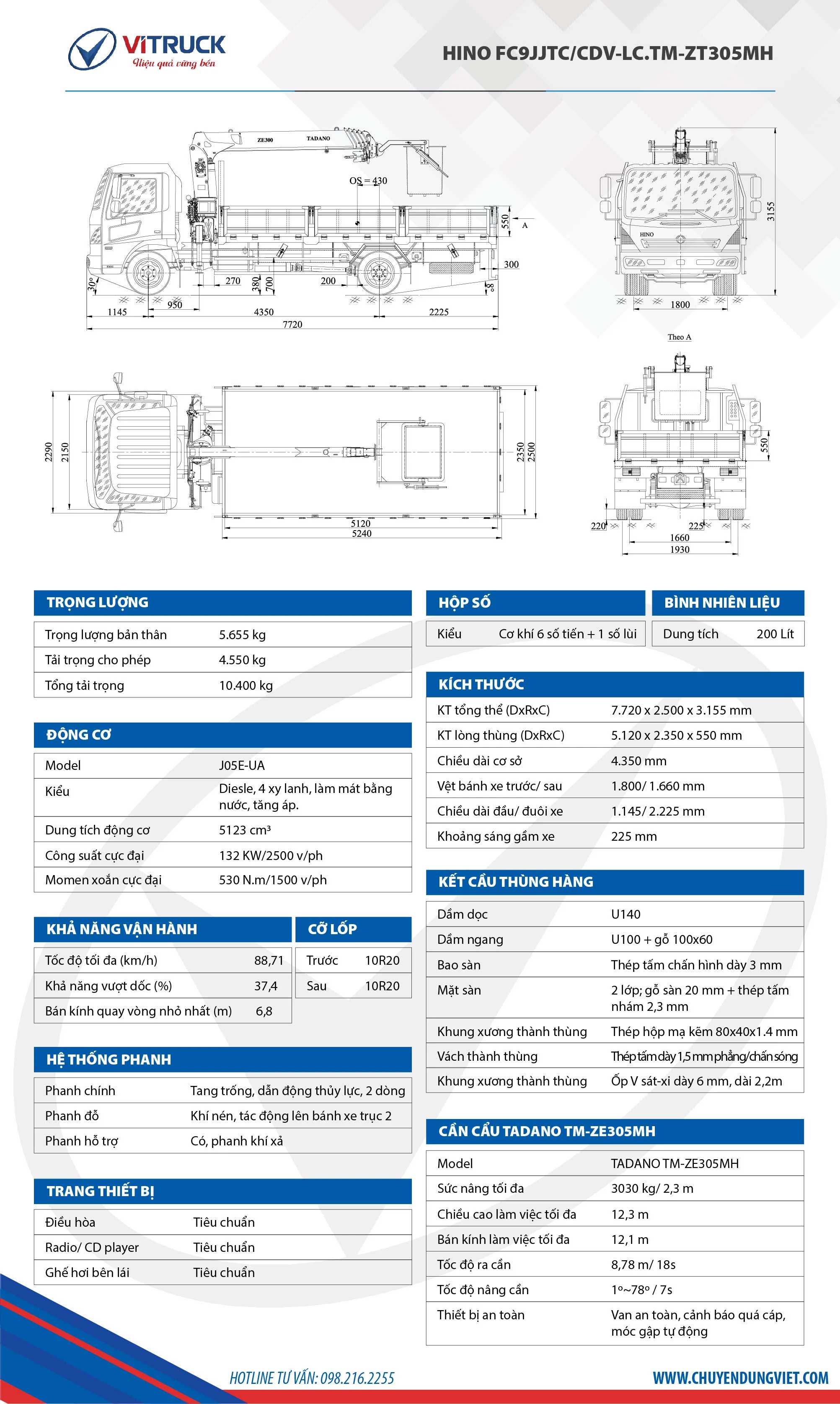 Xe tải cẩu Hino 5 tấn FC9JJTC (gắn cẩu Tadano 3 tấn 5 đốt TM-ZT305MH) là loại xe chuyên dụng để nâng, hạ và vận chuyển hàng hóa. Xe được thiết kế và sản xuất trên nền xe cơ sở Hino 6,4 tấn và cần cẩu Tadano 3 tấn 5 đốt là hai thương hiệu nổi tiếng của Nhật Bản về an toàn, chất lượng, bền bỉ và tin cậy. Xe có chiều dài lòng thùng 5,12 mét; tải trọng cho phép 4,55 tấn và được trang bị cần cẩu Tadano 3 tấn 5 đốt thích hợp để chở đa dạng các loại hàng hóa như thép ống, thép cuộn, cọc bê tông, máy móc thiết bị,...