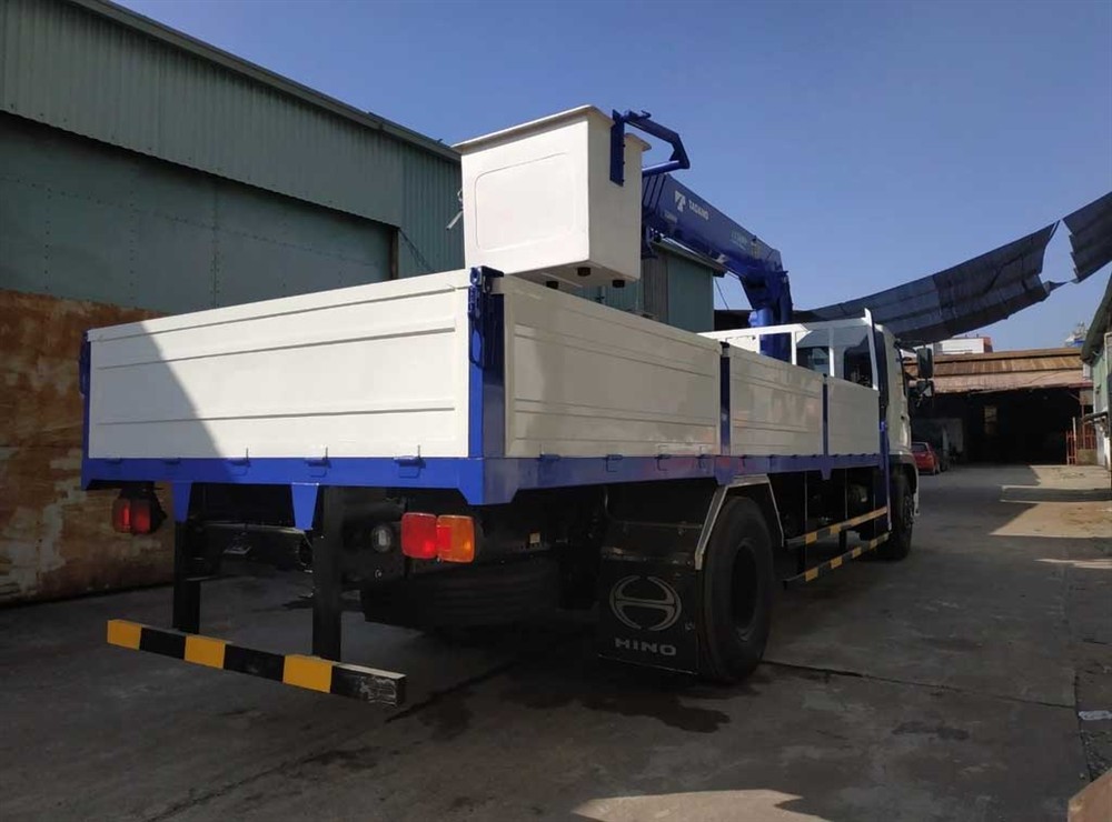 -Thùng hàng lắp trên xe tải cẩu Hino 9,4 tấn được thiết kế với 2 bửng hông, 1 bửng sau, các khung xương gia cường chắc chắn. Bên cạnh đó, sàn xe được lót một lớp gỗ dày 2 cm và một lớp thép tấm nhám 2,3mm giúp thùng xe khỏe hơn. Chiều dài thùng 6,5 m thích hợp chở đa dạng các loại hàng hóa kích thước lớn như thép ống, thép cuộn, inox…