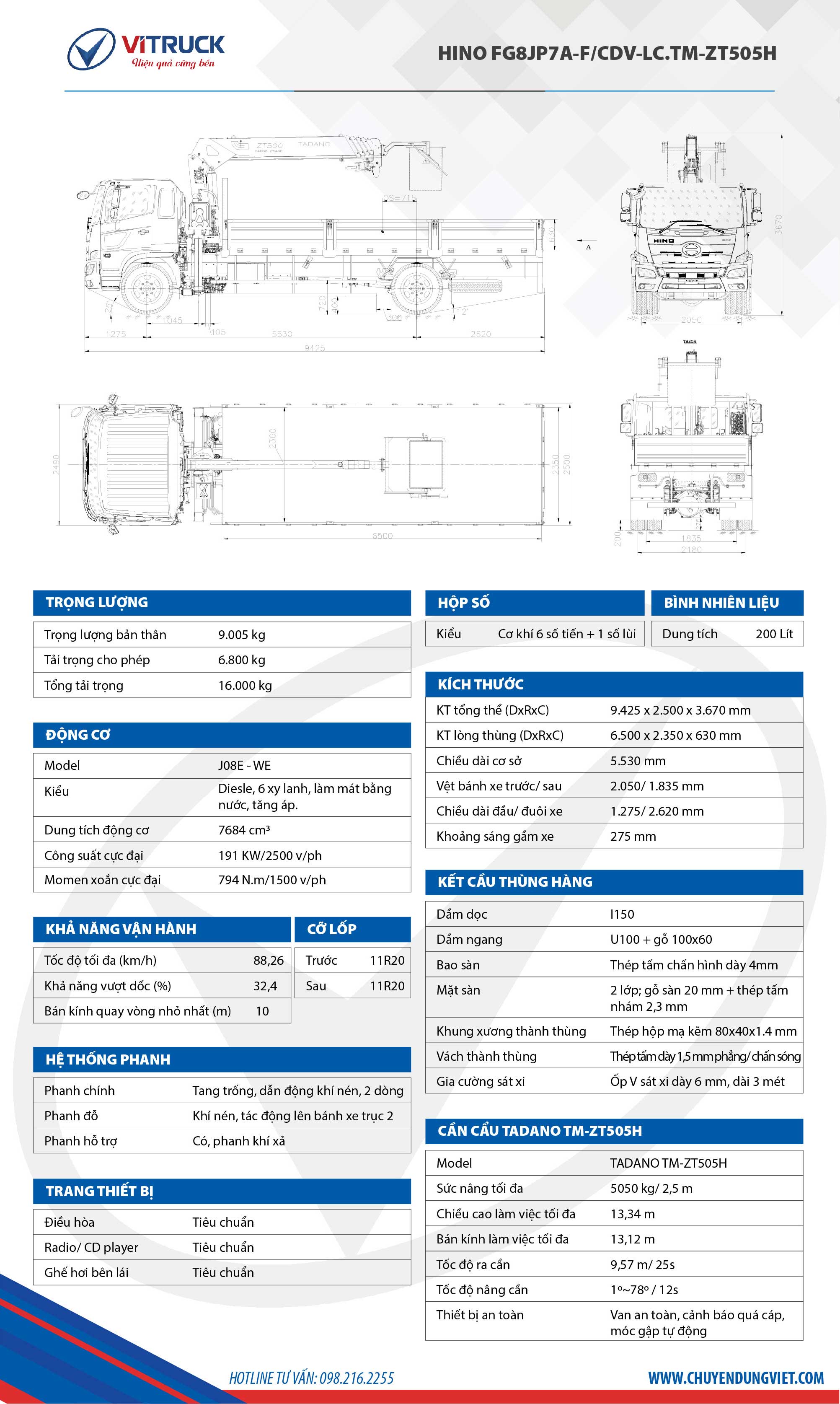Xe tải cẩu Hino 7 tấn Euro 4 (lắp cẩu Tadano 5 tấn 3 đốt) được thiết kế và lắp đặt từ xe cơ sở Hino FG8JP7A tiêu chuẩn khí thải Euro 4 và Cần cẩu Tadano TM-ZT505H (5 tấn 5 đốt) là hai thương hiệu nổi tiếng về chất lượng, tin cậy, bền bỉ và tiết kiệm nhiên liệu.