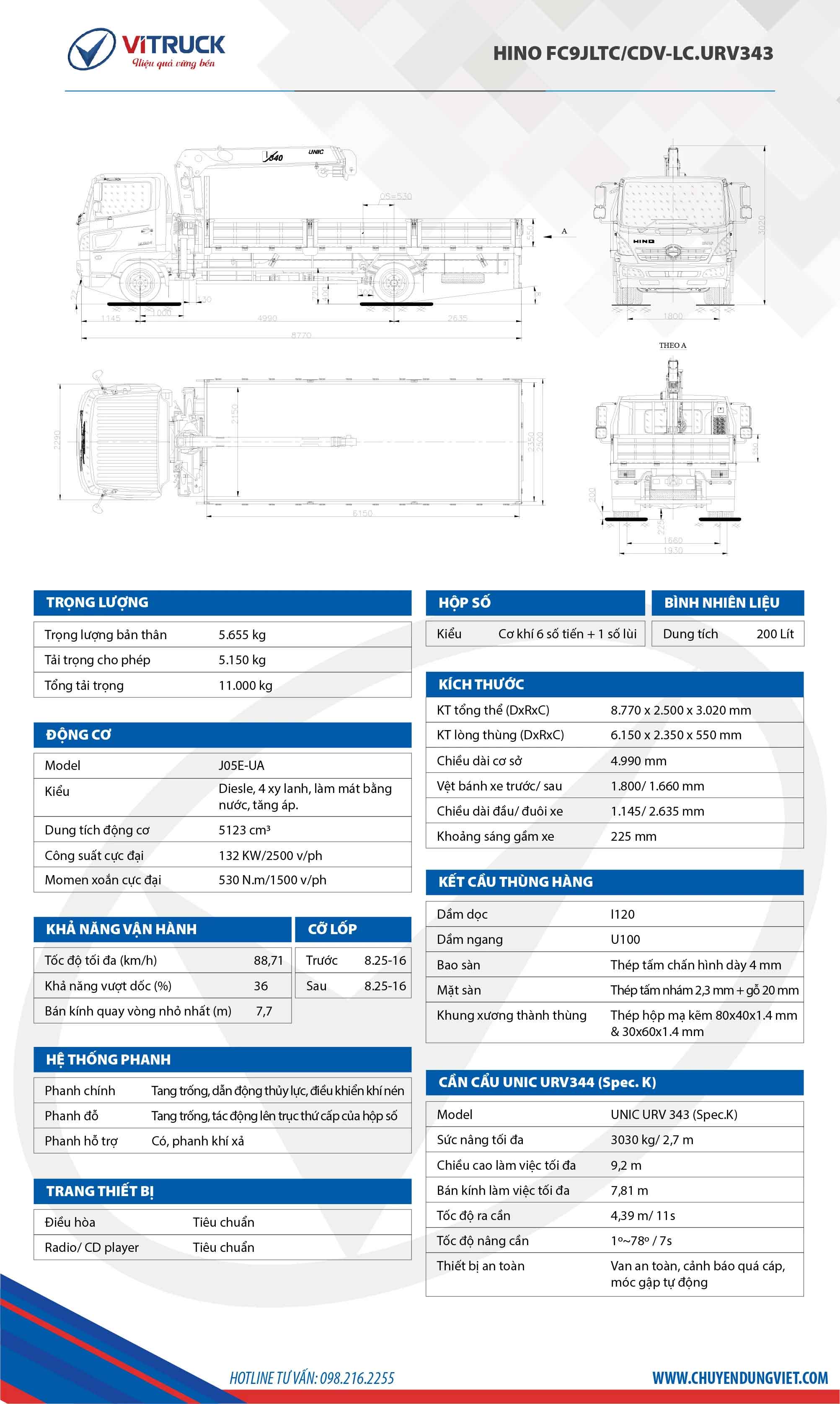 Xe tải cẩu Hino 5 tấn FC9JLTC (gắn cẩu Unic 3 tấn 3 đốt UR-V343K) là loại xe chuyên dụng để nâng, hạ và vận chuyển hàng hóa. Xe được thiết kế và sản xuất trên nền xe cơ sở Hino 6,4 tấn và cần cẩu Unic 3 tấn 3 đốt là hai thương hiệu nổi tiếng của Nhật Bản về an toàn, chất lượng, bền bỉ và tin cậy. Xe có chiều dài lòng thùng 6,15 mét; tải trọng 5,15 tấn và được trang bị cần cẩu Unic 3 tấn 3 đốt thích hợp để chở đa dạng các loại hàng hóa như thép ống, thép cuộn, cọc bê tông, máy móc thiết bị,...